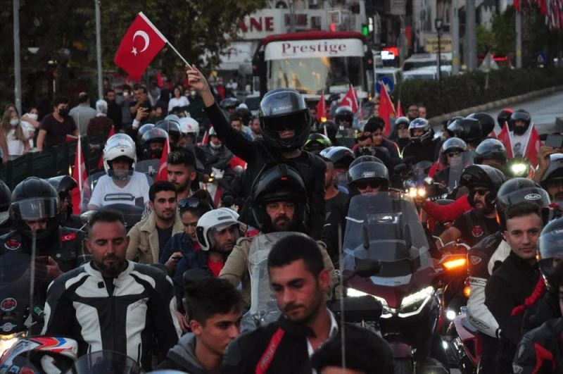 Türk bayraklari ve marslar esliginde caddelerde ilerleyen motosikletliler, görsel sölen olusturdu.