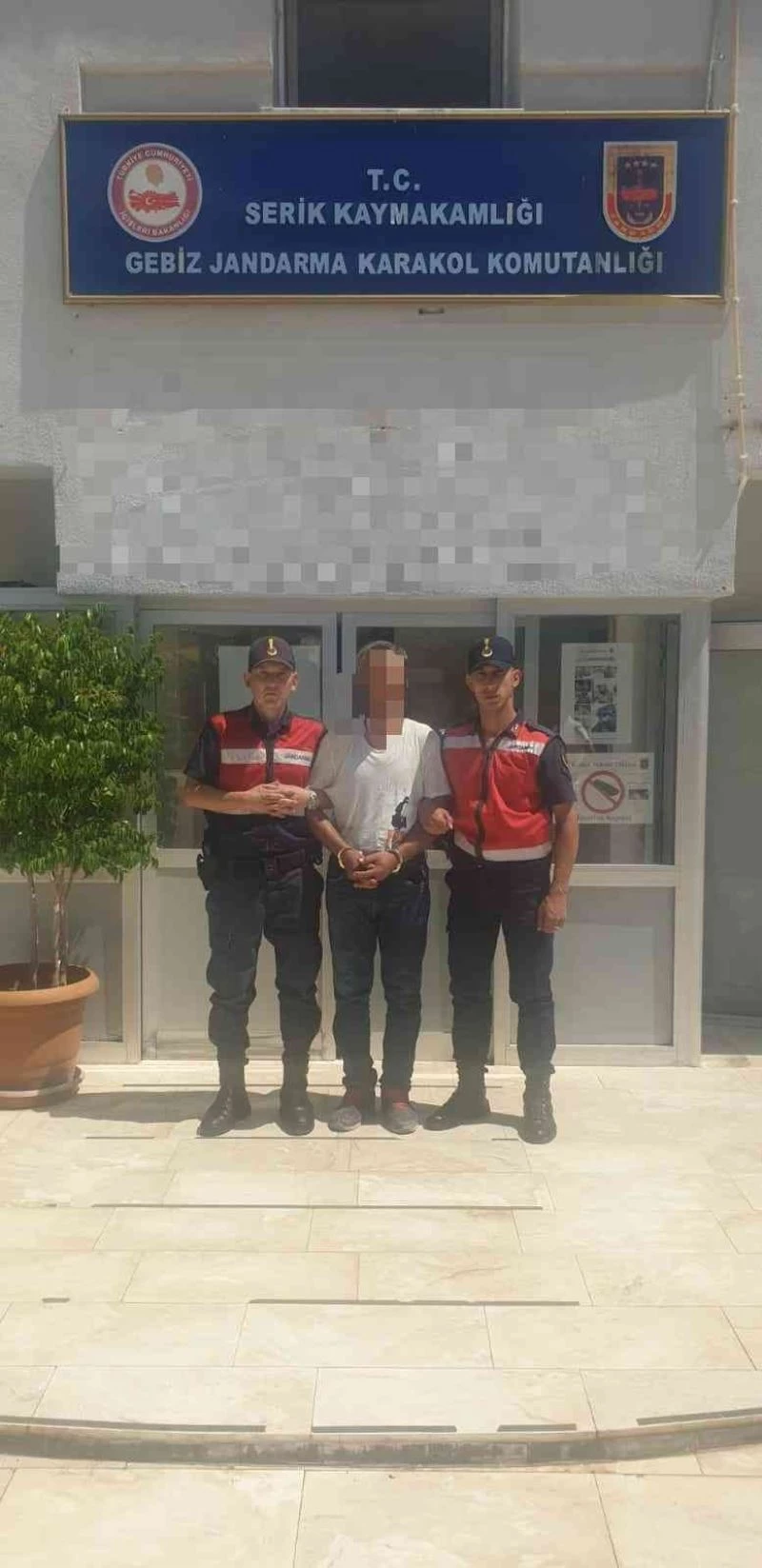 Antalya Cumhuriyet Başsavcılığının koordinesinde, Antalya İl Jandarma Komutanlığı Asayiş Şube Müdürlüğü JASAT Timleri ve Gebiz Jandarma Karakol Komutanlığına bağlı ekipleri, Serik ilçesinde nitelikli suçlardan aranan şahısların yakalanmasına yönelik yapılan çalışmalar neticesinde, çeşitli suçlardan 31 suç kaydı bulunan ve halen 2 ayrı hırsızlık suçundan hakkında 17 yıl 9 ay kesinleşmiş hapis cezasıyla aranan M. S. isimli şahsı, Dorumlar Mahallesi’nde babasına ait evde yakaladı.