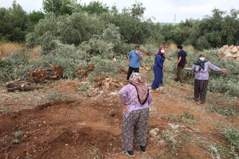 Göçerler Mahallesi 3373 ile 3374. Sokak arasında kalan 60 yaşındaki Fatma Yavuz’un 10 dönümlük arazisinin bir bölümü, imar çalışmaları kapsamında yakındaki bir inşaatın alanına kaydı. İddiaya göre inşaat alanının yer sahibinin oğlu A.D, dün öğle saatlerinde sınırları içinde kalan arazide kepçe ile çalışma yaptı. Yavuz ve yakınlarının evde olmadığı esnada araziye giren A.D, dikili olan 42 zeytin, 2 harnup, 1 dut, 2 nar ve asma ağaçlarını yerinden kökledi. 50 yıllık zeytin ağaçları hem yerinden köklendi hem de parçalandı. Üzerinde hasada gelmiş zeytinlerle yıkılan ağaçları gören Fatma Yavuz ve annesi 95 yaşındaki Hatice Göçeri gözyaşlarını tutamadı. Aile gördükleri manzara karşısında durumu polis ve Kepez Belediyesine bildirerek, tutanak tutturdu. Yıkılan ağaçlarının görüntülemesini yapan aile, konuyu yargıya taşımaya hazırlanıyor.