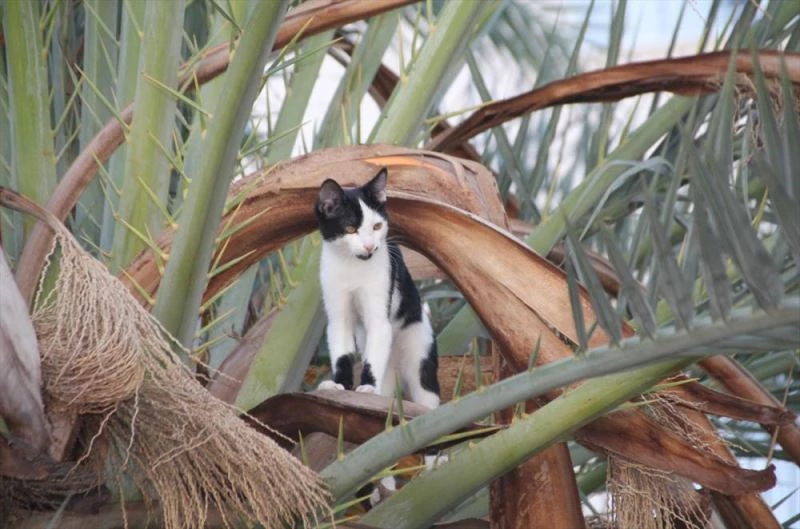 Merkez Mahallesi Tuncerpasa Caddesi'ndeki palmiye agacinda bir kedinin mahsur kaldigini görenler, durumu itfaiye ekiplerine bildirdi.