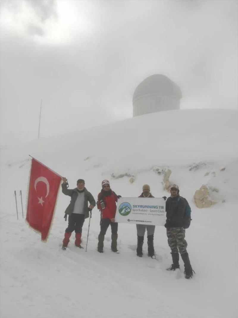 Yoğun sis altında gerçekleştirilen tırmanışta sporcular, zirvede Türk bayrağı açtı.