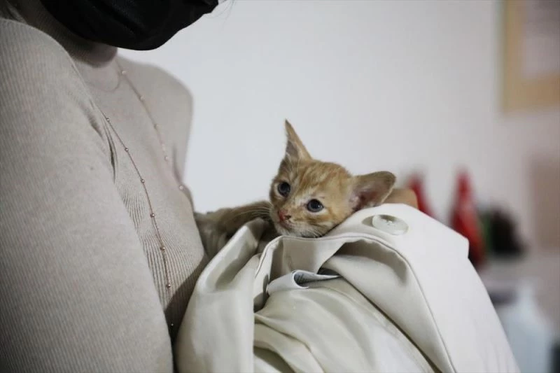 Belediye personellerinden Deniz Ak, kedi yavrusunu sahiplendi.