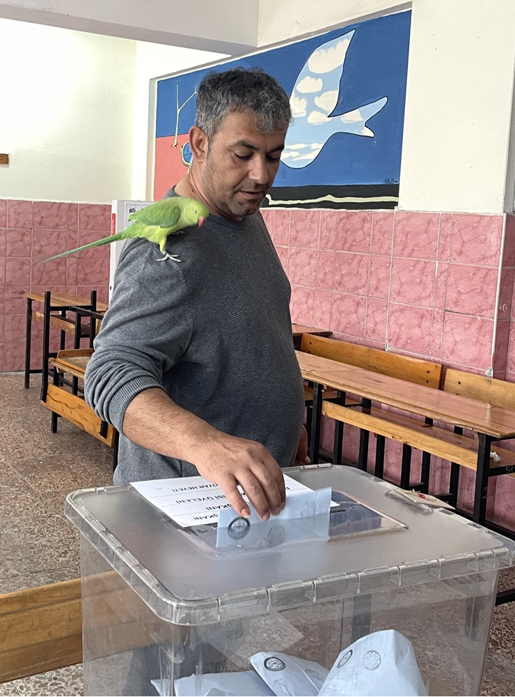 Oy kullanmaya papağanıyla konuşarak geldiğini belirten Işık, "Ben nereye gitsem Paşa yanımdadır. Taksicilik yapıyorum, akşama kadar araçta benimle geziyor. Birkaç kelime konuşabiliyor. Oy kullanmada da yanımdan ayrılmadı." dedi.
