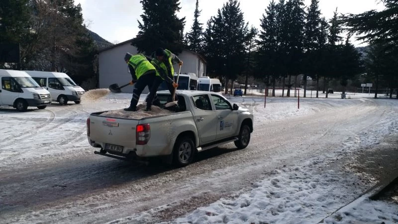 Antalya’nın yüksek kesimlerinde etkili olan kar yağışı nedeniyle buzlanma yaşandı. Büyükşehir Belediyesi buz tutan yollarda tuzlama çalışması yapıyor.