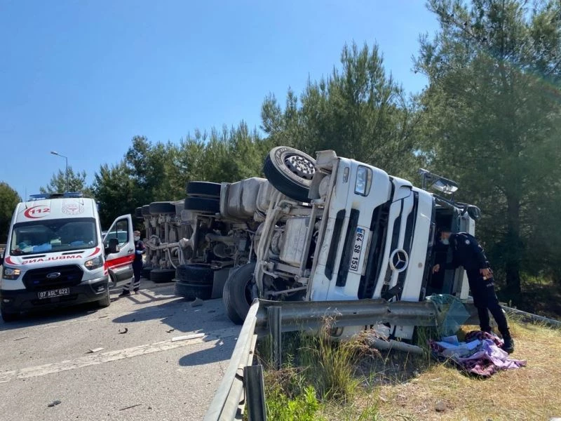 Antalya’nın Aksu İlçesi’nde sürücüsünün kontrolünden çıkan çimento yüklü tır yan yattı. Kazada yaralanan sürücü hastaneye kaldırıldı.