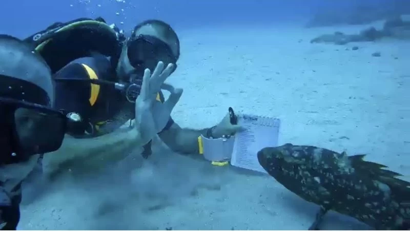 Bu sırada bir orfoz balığı Demirbaş'ın yanına yaklaştı. Demirbaş, karşısında hareketsiz bir şekilde duran balığa ders notlarını parmak işaretleriyle gösterdi.