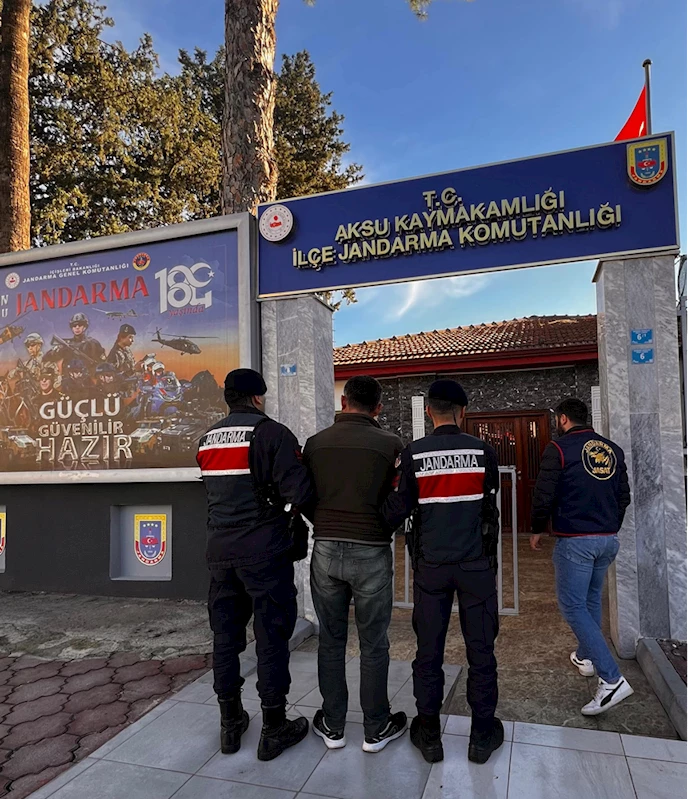 Bu kapsamda çeşitli suçlardan aranan ve hakkında 15 yıl 2 ay kesinleşmiş hapis cezası bulunan B. T. Aksu İlçe Jandarma Komutanlığı ekiplerince yakalanarak gözaltına alındı.