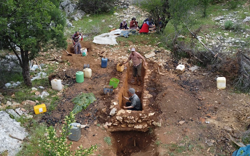 Kuyucak Mahallesi sakinleri, sedir katran yağı üretimi için bölgedeki 2500 rakımlı dağlarda yetişen sedir ağaçlarının kuruyan köklerini topraktan özenle çıkarıyor.