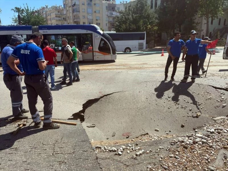 ANTALYA - Antalya'nın Kepez ilçesinde içme suyu ana isale hattındaki patlama nedeniyle yolda çökme meydana geldi.