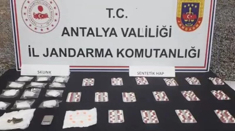 Antalya’da Jandarma ekiplerince yapılan çalışmalar sonucunda; 224 adet uyuşturucu galara hap, 8 adet uyuşturucu ekstacy hap,13 paket satışa hazır skunk ve 1 adet hassas terazi ele geçirildi.