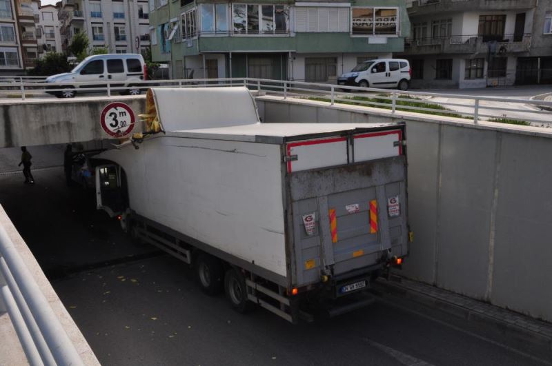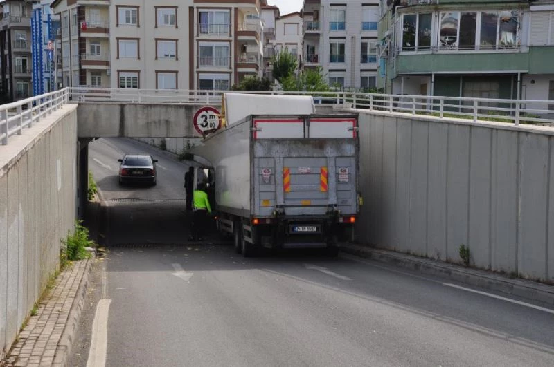 Köprüye sikisan kamyonun sürücüsü, trafik ekiplerinin islemlerinin ardindan kendi imkanlariyla araci bulundugu yerden çikardi. Kamyonun üst bölümünde hasar olustu.
