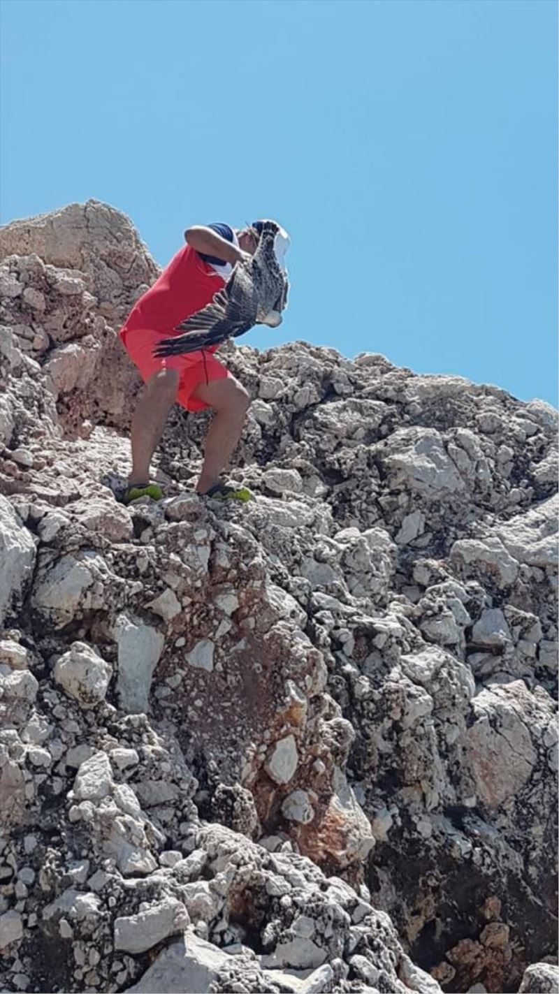 Kayaliklara tirmanan Akyurt, martinin ayaklarina dolanan oltanin ignesinin de gagasina battigini gördü.