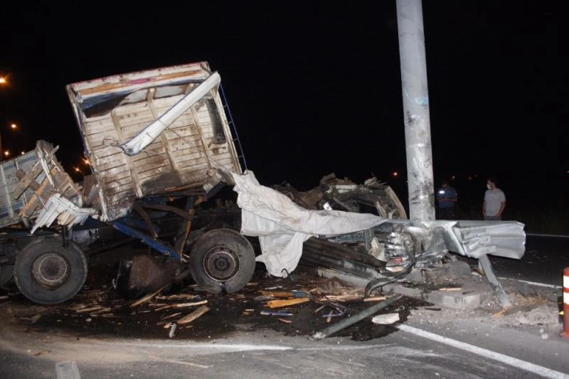 Antalya’da meydana gelen feci kazada direğe ve bariyerlere çarpan kamyon köprü girişinde parçalara ayrıldı. Kaza yapan kamyonu son anda fark eden otomobil, kamyonun kasasına çarparak hurdaya dönerken, yaklaşık 100 metre ileride durabildi. Kazada yaralanan kamyon ve otomobil sürücüleriyle kamyonda yolcu olarak bulunan 1 kişi araçlardan itfaiye ekiplerince çıkarıldı.