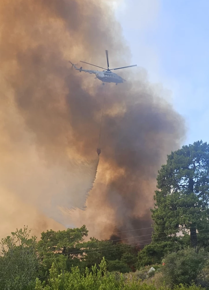 Yangına 8 uçak, 6 helikopter, 22 arazöz, 6 su ikmal aracı, 5 iş makinesi ve çok sayıda yangın söndürme işçisi ile müdahale ediliyor.