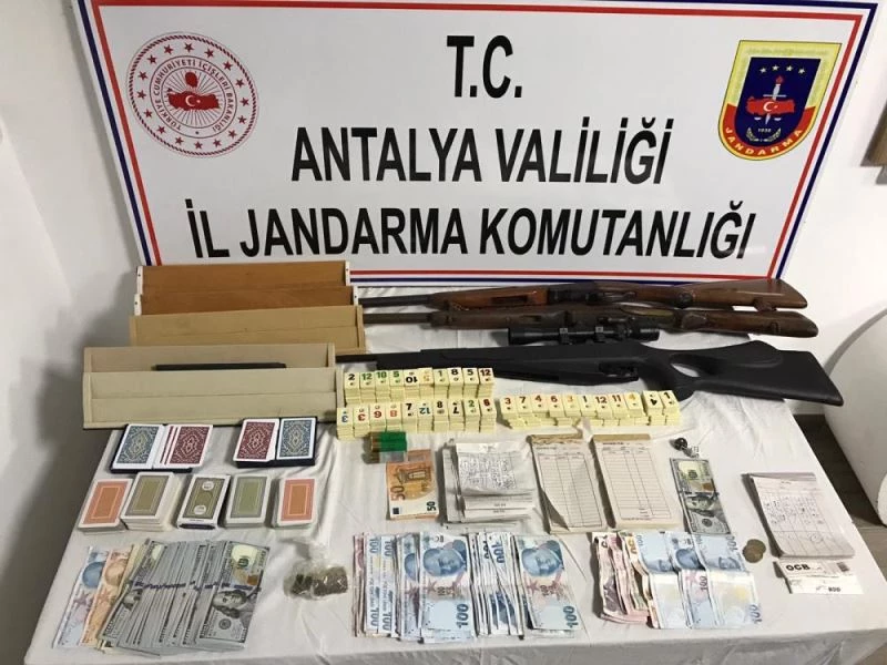 Ekiplerce, masada bulunan 2 okey takimi, 6 deste iskambil kagidi, 2 gram esrar, is yerindeki 3 av tüfegi ile sahislarin üzerindeki 5 bin 762 lira, 50 avro, 8 bin 100 dolara da el konuldu.