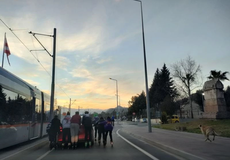 Patenli gençlerin tehlikeli yolculukları Muratpaşa ilçesi Konyaaltı Caddesi ve Varyant bölgesinde kameralara yansımaya devam ediyor. Kural tanımayan patenli çocuklardan bu kez 8’inin aynı anda bir otomobile ve birbirlerine tutunurken yaptıkları yolculuk cep telefonu kameralarına yansıdı. Kırmızı ışıkta bekleyen otomobilin arkasına ve yanına tutunan çocuklar şoförün uyarılarını dikkate almadı. Aracın hareket etmesiyle yolculuklarına devam eden çocukların birbirlerini de tuttukları görüldü. Kırmızı ışıkta dahi aracı bırakmayan patenli çocukların dans ettiği anlarda kameralarca kaydedildi. Otomobili çevreleyen çocukların ölüme davetiye çıkaran yolculukları Yavuz Özcan Parkı’ndan, müze önüne kadar devam etti. Bir köpeğinde kendilerine eşlik ettiği çocuklar, müze kavşağında tutundukları aracı bıraktıktan sonra yollarına Sahil Antalya Yaşam Parkı’nda doğru devam etti.
