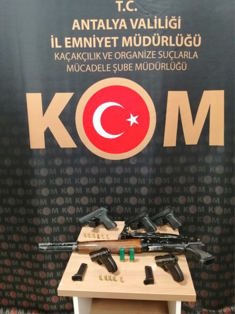 Antalya Cumhuriyet Başsavcılığı koordinesinde, Kaçakçılık ve Organize Suçlarla Mücadele Şube Müdürlüğü tarafından yapılan iki farklı operasyonda ruhsatsız tabanca getirip piyasaya sürerek silah ticareti yapan 3 kişi gözaltına alındı. Toplam 5 adet farklı model ve çapta tabanca, bu tabancalara ait şarjör, 11 adet tabanca mermisi, 1 adet katlanabilir dipçikli otomatik yivsiz av tüfeği ve 2 adet av fişeği ele geçirildi, dijital materyallere el konuldu.