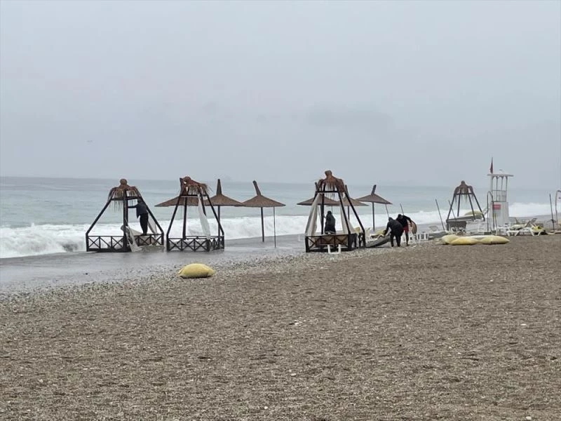 Konyaaltı Sahilinde metrelerce yüksekliği bulan dalgalar sahildeki işletmelere zor anlar yaşattı. İşletmeler yağış ve dalgadan zarar gören şezlong ve şemsiyeleri kurtarmaya çalıştı.