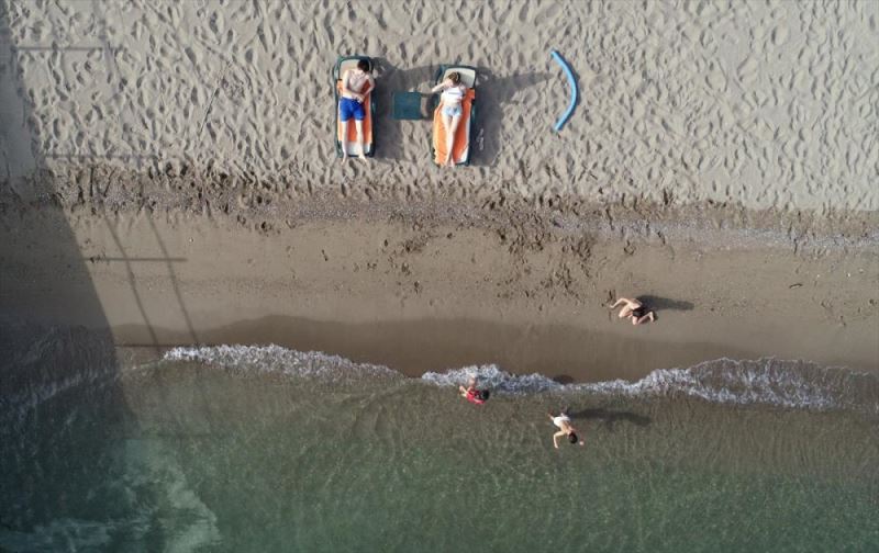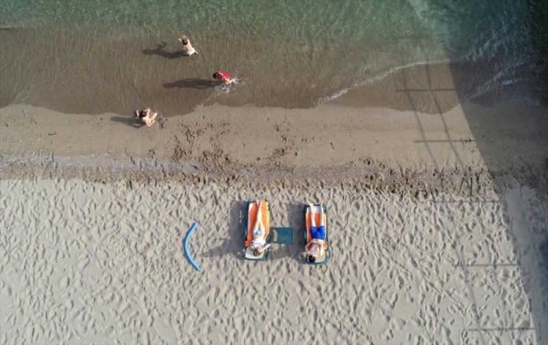 Sabah saatlerinden itibaren sahile giden vatandaslar, sosyal mesafe kuralina uygun yerlestirilen sezlonglarda güneslendi, denize girmenin keyfini yasadi.