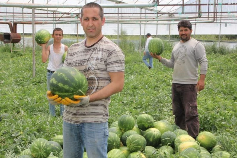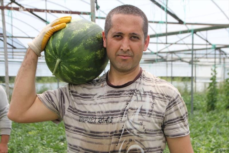 Yeni tip koronavirüsle (Kovid-19) mücadele kapsaminda uygulanan sokaga çikma kisitlamasindan muaf tutulan çiftçiler, seralarinda sezonun ilk karpuz hasadini yapti.