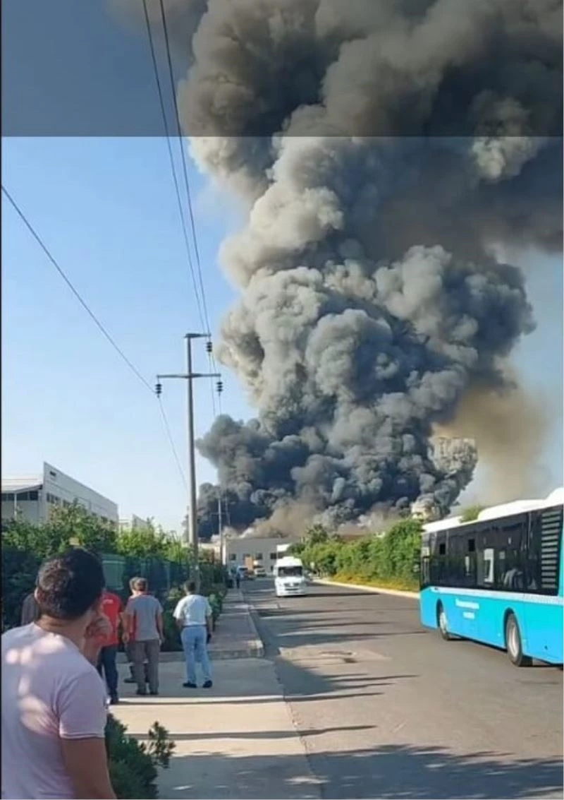 Antalya Organize Sanayi Bölgesinde soğuk hava deposu üretimi yapılan bir fabrikada çıkan yangını söndürme çalışmaları devam ediyor.