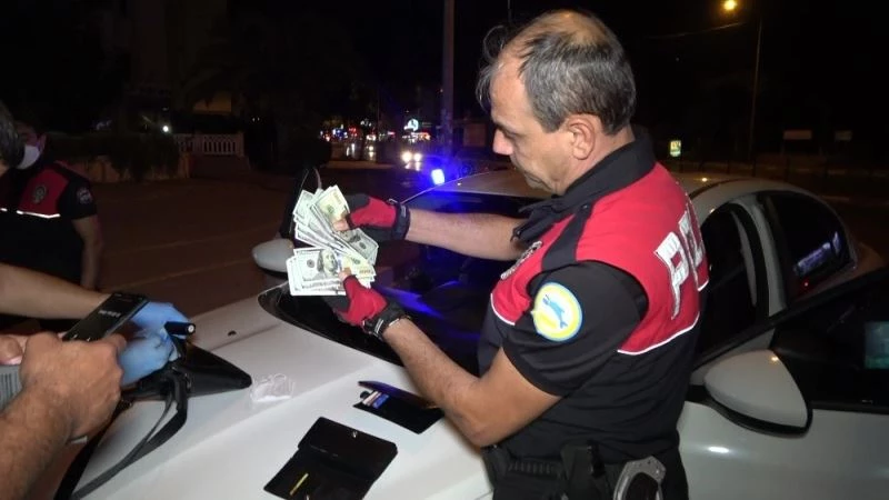 Antalya’da polis ekiplerinin şüphe üzerine yakaladıkları araçtan bol miktarda döviz ve uyuşturucu madde çıktı.