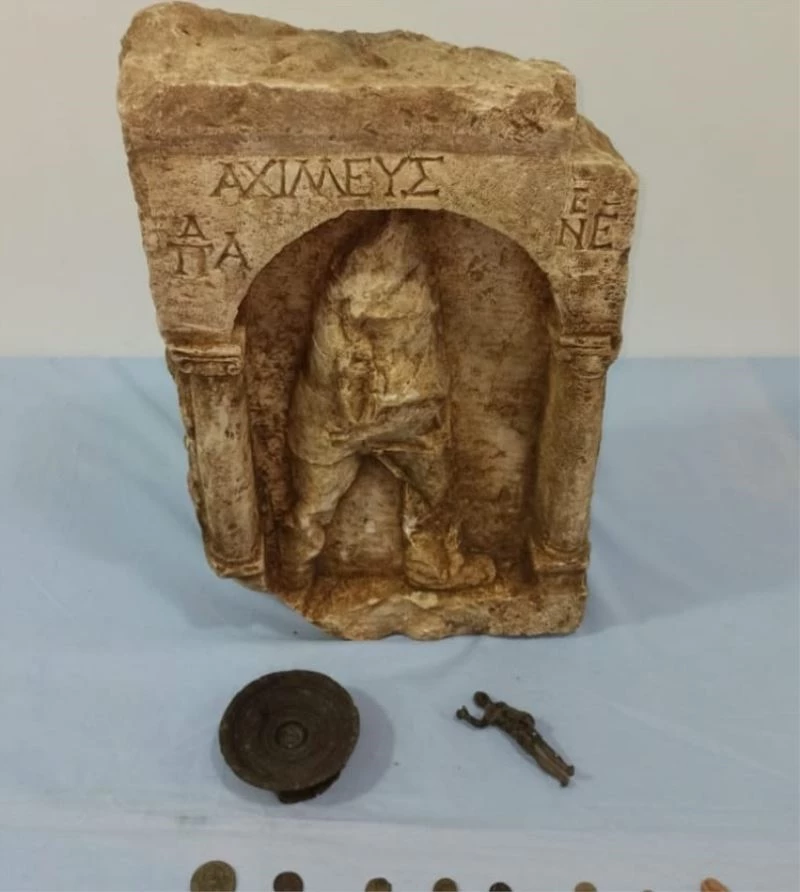 Ekiplerin yaptigi aramada, 1400 yillik oldugu tahmin edilen islemeli Roma dönemi mezar tasi, bronz heykel figürü ve 7 sikkenin de aralarinda bulundugu 11 parça tarihi eser ele geçirildi. Eserler müze müdürlügü yetkililerince incelemeye alindi.