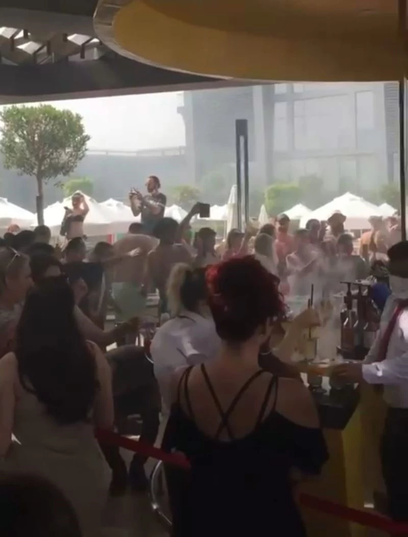 Görüntülerde, yüzlerce kişinin müzik eşliğinde, sosyal mesafesiz eğlendiği görülürken sadece otel çalışanlarının maske takması dikkat çekti.