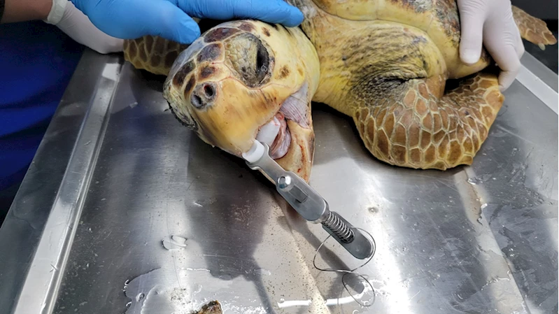 Derneğin saha ekipleri, Prof. Dr. Hakan Sert, Prof. Dr. Cengiz Deval ve Prof. Dr. Ertan Taşkavak'ın danışmanlığında, olta kancası yüzünden ağız bölgesi parçalandığı anlaşılan deniz kaplumbağasını, Doğa Koruma ve Milli Parklar ekiplerinin desteğiyle ilçedeki Apollon Veteriner Kliniği'ne ulaştırdı.
