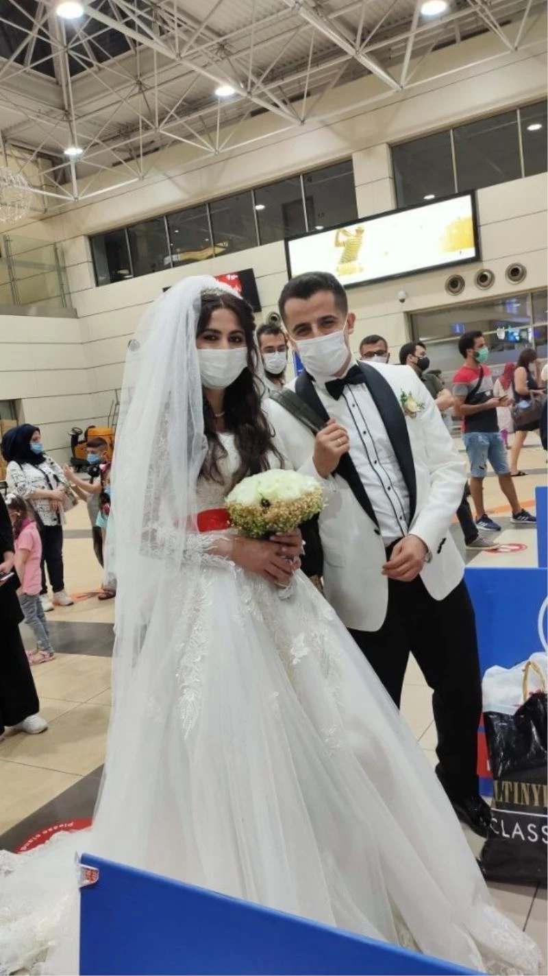 Mersin’de düğünden çıkıp balayı için Antalya uçağına son anda yetişen yeni evli çift, üzerlerini bile değişecek fırsat bulamayınca havalimanına gelinlik ve damatlıkla girmek zorunda kaldı. O anlarsa diğer yolcuların cep telefonlarıyla görüntülendi.