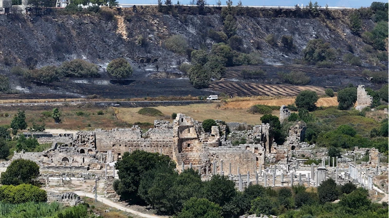 Perge Antik Kenti sınırlarına yaklaşan ve büyük bölümü kızılçam ormanı olan yanan alanlar, dronla görüntülendi.