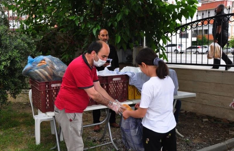 Caminin imam hatibi ve Vefa Sosyal Destek Grubu Görevlisi Ahmet Aladag ile gönüllü 3 kisi, firindan gelen ekmekleri, cami bahçesinde her gün vatandaslara ücretsiz dagitiyor.