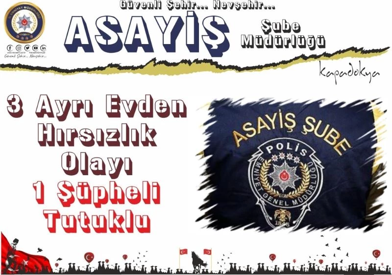 Nevşehir’de 3 ayrı evden hırsızlık yapan bir kişi, çaldığı eşyalar ile birlikte yakalandı.