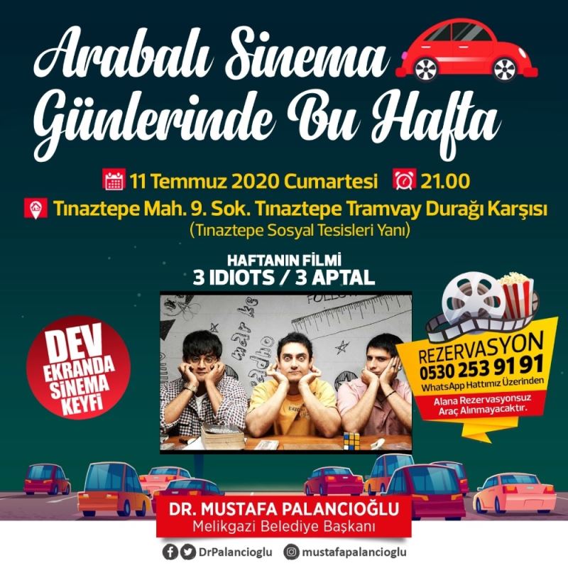 Melikgazi Belediyesi arabalı sinema günlerinin 5. gününde bir Bollywood yapımı olan "3 İdiots-3 Aptal" filmini 11 Temmuz 2020 Cumartesi günü izleyici ile buluşturacak.