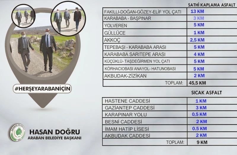Araban Belediye Başkanı Hasan Doğru, sosyal medya hesabı üzerinden yaptığı açıklamada, "Geçen yıl kış mevsiminde yaşanan yağışlar ve don nedeniyle ilçe kırsalındaki Fakılı-Doğan- Gözey ve Elif yol ayrımları ile Karababa-Başpınar, Yolveren, Güllüce, Akkoç, Tepebaşı-Karababa arası, Karababa-Sarıtepe arası, Küçüklü-Taşdeğirmen yol çatı, Körhacıobası anayol-Hatunobası ve Akbudak-Zizikan kırsal mahalle yollarımız olmak üzere üzere toplam 45,5 kilometre sathi kaplama asfalt yapılacak. İlçe merkezimizdeki Hastane Caddesi, Gaziantep Caddesi, Karapınar Yolu, Besni Caddesi, İmam Hatip Lisesi yolu ve Akbudak Caddesinde ise toplam 9 kilometre sıcak asfalt olmak üzere genel toplamda 54,5 kilometre asfalt çalışması’nın Haziran ayında başlayacak. Asfalt seferberliğine Gaziantep Büyükşehir Belediyesi Fen İşleri Daire Başkanlığı tarafından başlanacak. Bölge halkının heyecanla beklediği asfalt çalışmaları için şimdiden Gaziantep Büyükşehir Belediyesi Başkanımız Sayın Fatma Şahin’e teşekkür ederim" ifadelerini kullandı.