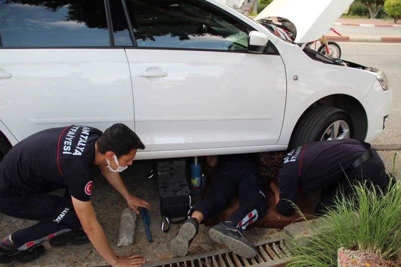 Antalya’da bir aracın motoruna sıkışan yavru kedi, 2 saatlik çalışmayla kurtarıldı.