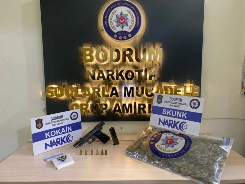 Edinilen bilgiye göre, Bodrum Narkotik Suçlarla Mücadele Grup Amirliği ekipleri, uyuşturucu tacirlerine göz açtırmıyor. Ekipler, yürüttükleri çalışmalar neticesinde plakası belirlenen bir araçla ilçeye uyuşturucu madde getireceği yönünde bilgi aldı. Araç, Bodrum Cumhuriyet Başsavcılığı koordinesinde Torba Kontrol noktasında durdurulmaya çalışıldı. Araç sürücüsü, aracını ekiplerin üzerine sürerek kaçmaya çalıştı. Kısa bir kovalamacanın ardından yakalanan şahsın kullandığı araç ve ikametinde yapılan aramada 250 gram skunk, daralı 4 gram kokain ve bir adet ruhsatsız tabanca ele geçirildi.