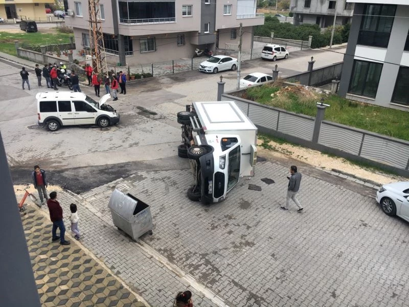 Mersin’in Erdemli ilçesinde hafif ticari araçla çarpışan kamyonet devrildi, sürücüler yara almadan kurtuldu.