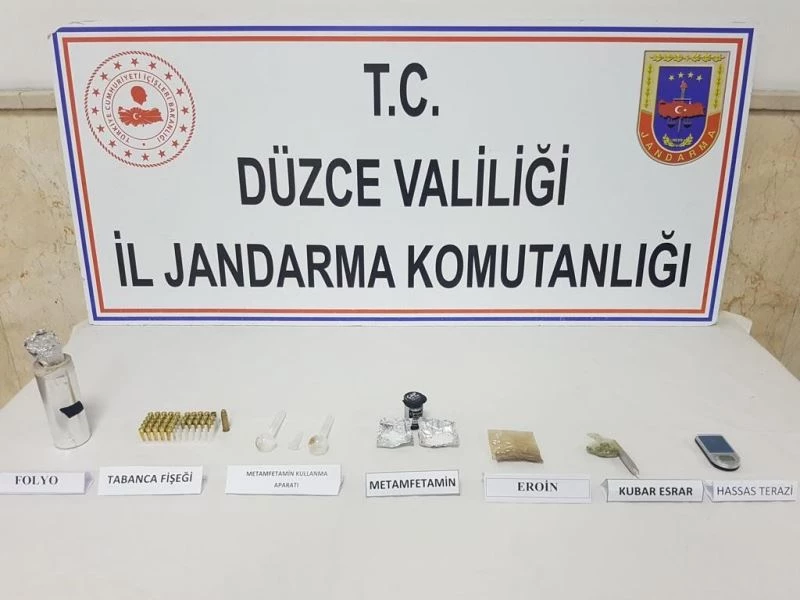 İl Jandarma Komutanlığı ekipleri, Düzce Merkeze bağlı Kemerkasım köyünde N.İ. isimli şahsın uyuşturucu madde ticareti yaptığı bilgisini elde etti. Bunun üzerine ekipler, Kemerkasım köy yolu üzerinde içeresinde M.İ. ve P.C.’nin bulunduğu aracı durdurarak KOM şube narkotik arama köpeği ile birlikte arama yaptı. Yapılan aramada araç içinde 3 gram metamfetamin, 3 gram kubar esrar, 40 tabanca fişeği, 1 hassas terazi ve 2 metamfetamin kullanma aparatı ele geçirildi. Şahsın evinde yapılan adli aramada da, 3 gram eroin yakalandı. Şüpheli N. İ. ve P. C., ’uyuşturucu madde imal ve ticareti’ suçundan gözaltına alındı. Olayla ilgili adli tahkikat sürüyor.