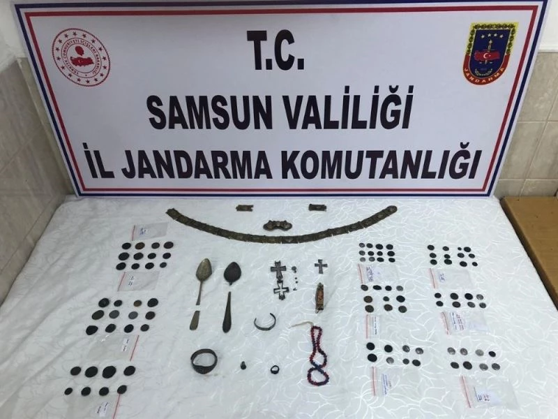Samsun ili Vezirköprü ilçesi Oruç Mahallesi’nde 03 Haziran 2020 günü şüpheli 3 şahsa ait 2 araçta Vezirköprü Cumhuriyet Başsavcılığı’ndan alınan karara istinaden arama yapıldı. Yapılan aramada tarihi değeri olduğu değerlendirilen 103 adet sikke, 1 adet yüzük, 1 adet mühür, 1 adet üzerinde kadın motifi işlemeli haç sembolü, 1 adet kemer, 1 adet çakı, 1 adet bileklik, 1 adet bilezik, 2 adet kaşık ve 1 adet tesbih ele geçirildi. Olayla ilgili 3 şahıs gözaltına alındı. Tahkikata başlandı.