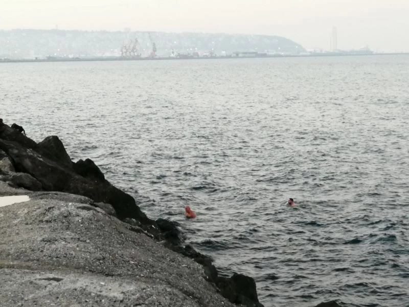Samsun’da 2 sporcu kafadar ilk önce Doğu Park Sahil Yolu’nda yürüyüş yaptılar. Daha sonra kayalıklara gelen sporcular, üstlerini çıkartarak şortla Karadeniz’in soğuk sularına kendilerini bıraktılar. Kıyıdan yaklaşık 1 kilometre uzaklaşan vatandaşlar, karada bile üşüyen vatandaşların tüylerini diken diken ettiler.