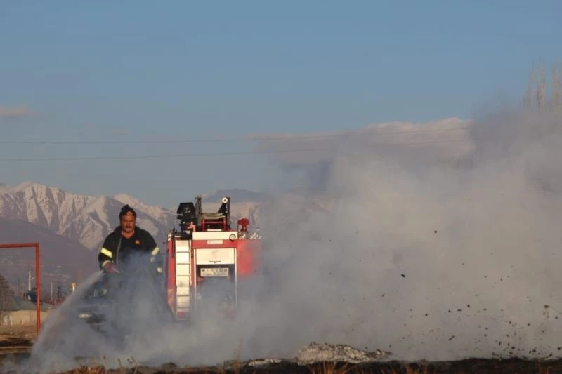 Erzincan merkez Köprübaşı köyü kırsalında arazide çıkan yangında tarım aletleri zarar gördü.