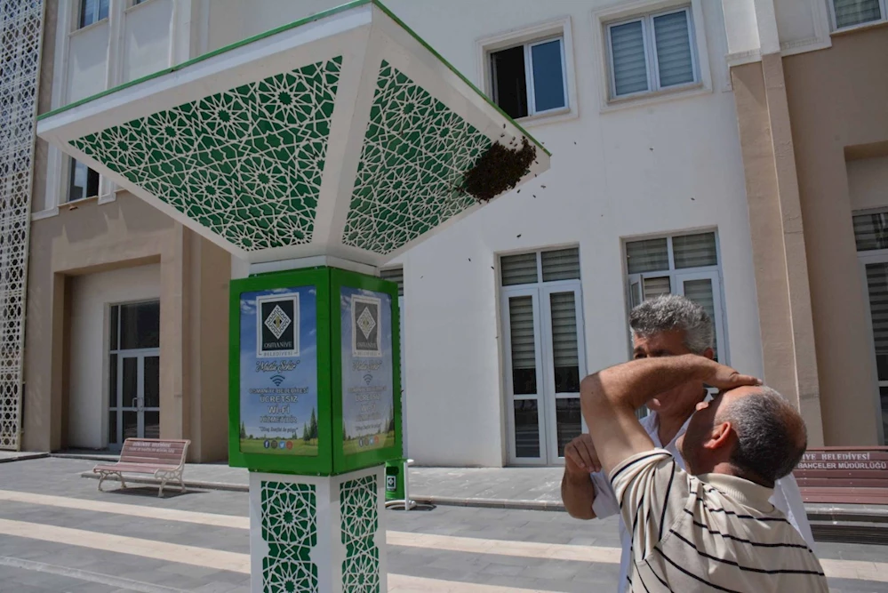 Osmaniye`de belediye binası girişinde bulunan, kablosuz internet dağıtım merkezi bankının güneş enerji paneline oğul atan arılar, heyecanlı anlar yaşattı. Belediye hizmet binasına gelen vatandaşlar, bölgede arıların çoğaldığını fark edince tedirgin olup durumu itfaiye ekipleri ile arıcılara bildirdiler. Kısa sürede sayıları artarak panel üzerinde kümelenen arılar, belediye personeli Şahin Tülüce, Enver Orman ve çağrılan arıcılarla birilikte, kovanlara alınarak bölgeden uzaklaştırıldı. Kraliçe arı ve diğer arıların bölgeden alınmasıyla vatandaşlar ve belediye çalışanları da rahat bir nefes aldı.