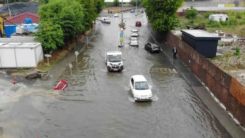 Arnavutköy’de sağanak yağış sonrasında bir cadde adeta göle döndü. Caddeden geçmeye çalışan araç sürücüleri zor anlar yaşarken, o anlar havadan görüntülendi.
