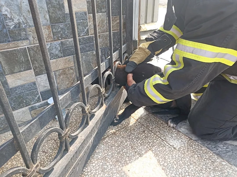 HATAY - Hatay'ın Arsuz ilçesinde bir evin bahçe kapısına sıkışan köpek, itfaiye ekibince kurtarıldı.