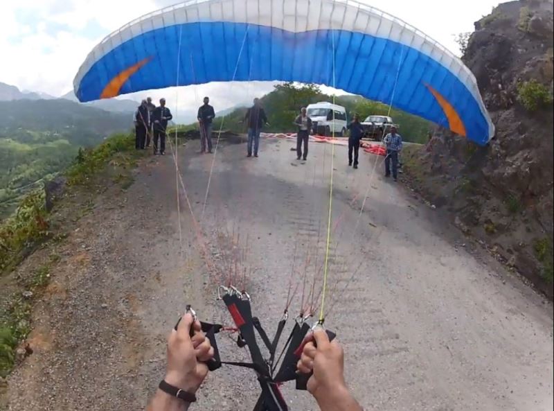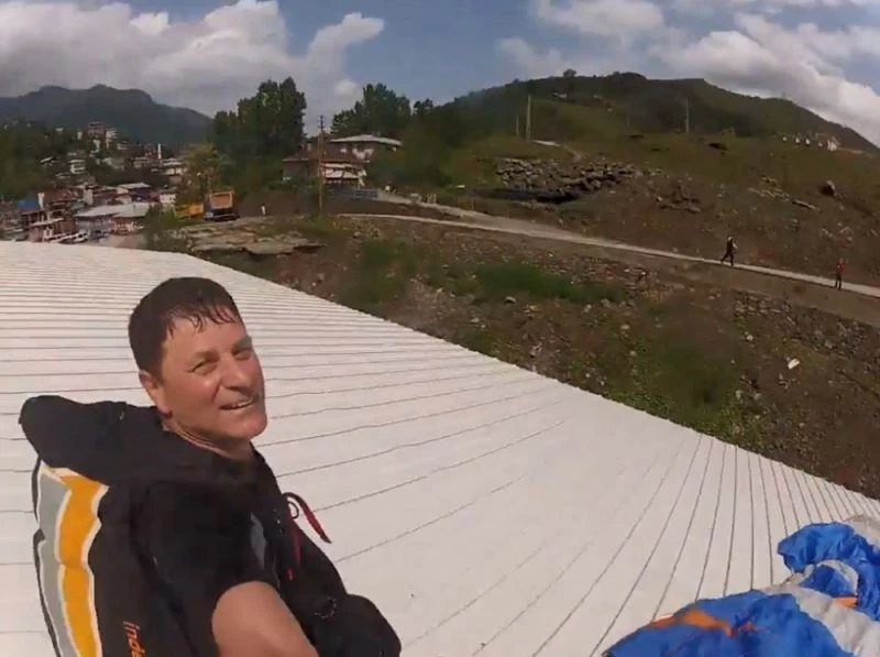 Artvin’in Murgul ilçesinde bir grup yamaç paraşütçüsü atlayış gerçekleştirdi. Haluk Erdoğan isimli paraşütçü, iniş sırasında irtifa kaybedince, bölgede bulunan bir fabrikanın çatısına zorunlu iniş yaptı. O anlar ise kask kamerasına saniye saniye yansıdı.