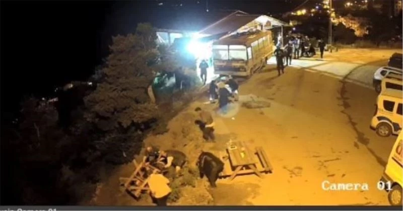 Artvin’in Şavşat ilçesi seyir teraslarının bulunduğu alanda otobüsü restorana çeviren Kazım Ekinci, otobüs içinde pişirdiği yiyecekleri müşterilerine servis ediyor. Yemeklerini yemek isteyen müşteriler, otobüsün etrafına kurulmuş piknik masalarını kullanırken, 17 Haziran tarihinde kaydedilen görüntülerde, işletmenin önünde bulunan piknik masalarına oturan 3 kişi yemeklerini yedikten sonra kalmak istedi. Masada oturandan birinin kalkmasıyla dengesini bozulan masa, üzerinde bulunan iki kişiyle birlikte yamaca doğru devrildi. Etraftakilerin yardımıyla yamaca deviren iki kişi kurtarılırken, yara almadan atlatılan kaza ise güvenlik kamerasına saniye saniye yansıdı.