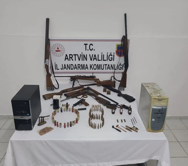 Artvin İl Jandarma Komutanlığı Merkez İlçe Jandarma Komutanlığınca yürütülen bir soruşturma kapsamında merkeze bağlı Kalburlu köyünde ikamet eden Y.Ç. isimli şahsın evinde ve eklentilerinde arama yapıldı. Yapılan aramalarda soruşturma ile ilgili olduğu değerlendirilen 1 adet cep telefonu, 2 adet bilgisayar kasası, 1 adet ruhsatız tabanca ve bu tabancaya ait 23 adet 9 milimetre çapında fişek, 4 adet ruhsatsız av tüfeği, 1 adet silah gövdesi, 55 adet 7,62 milimetre çapında, 17 adet 8,57 milimetre çapında fişek ve fişek dolumun da kullanıldığı değerlendirilen çok sayıda materyal ele geçirildi.