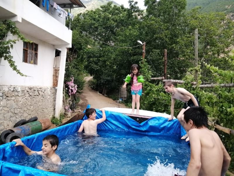 Artvin’de köy öğretmeni korona virüs nedeniyle denize gidemeyen çocuklar için kamyonet kasasını aqua parklı havuza çevirdi.
