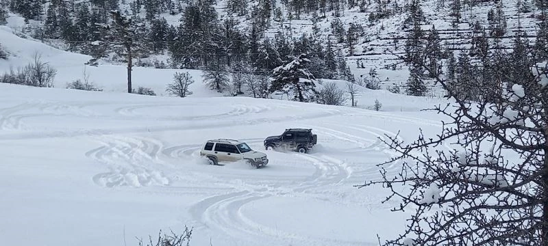 Safari tutkunları, kar kalınlığının yaklaşık 1 metreyi geçtiği Aros Yaylasına gidebilmek için adrenalin dolu anlar yaşadı. Bazı araçlar yolda kalırken, insan gücü ve off-road donanımlı araçlarından bulunan çekme aparatı yardımıyla kara saplandığı yerden çıkartılar.